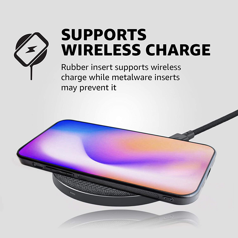 WIRELESS CHARGE > The inserts made of METALWARE may prevent wireless charges to work properly. This is why this case comes with a FLEXIBLE CUSTOM PLASTIC INSERT which supports wireless charge and while it is still perfect for sublimation as it is DURABLE AGAINST the high temperature. (advised to apply medium pressure, 356°F, 50 seconds)