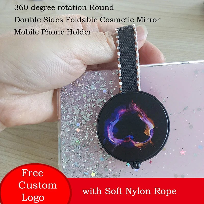 2. 360 degree rotation Round Double Sides Foldable Cosmetic Mirror Mobile Phone Holder with Soft Nylon Rope